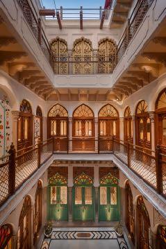 Especially popular with history enthusiasts, nowadays Haveli Dharapmura is a heritage hotel, museum, library, cultural center and performance venue, all in one. Every individually styled room, named after an Old Delhi market or a gate, is designed to maximize space and give the feeling of luxury with light interiors and Mughalstyle furnishings like wooden ceiling fans and carved bedposts. The pillared galleries enfolding the central courtyard lead to an airy roof terrace where you can have a cup of aromatic masala chai while enjoying a birds-eye view of the eclectic neighbourhood.