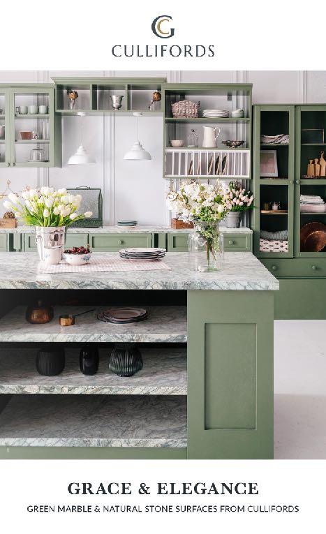 Nothing catches the eye quite like a statement splashback in the kitchen. For a striking yet understated introduction of green, consider a dramatic Onyx surface to contrast against a clean, white scheme. Onyx Smeraldo is a transluscent stone characterised by powerful striations of greens, reds and browns, and is guaranteed to add the wow-factor to the heart of the home. A quartzite with depth, Caravaggio displays a range of reddish and brown hues in a mesmerising pattern, with striking veins of white and grey throughout. Ideal for more luxeinspired kitchen settings, this unique material will add a refined essence to the finished scheme.