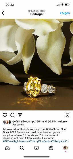 This vibrant ring from Tiffany & Co’s BOTANICA: Blue Book 2022 features an oval, unenhanced yellow sapphire of over 10 carats and 15 cushion-cut diamonds of over 4 total carats.