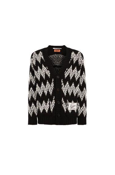 It is the sculptural-looking maxi chevron motif that almost threedimensionally scans the two-tone texture of the men's wool-blend cardigan with long