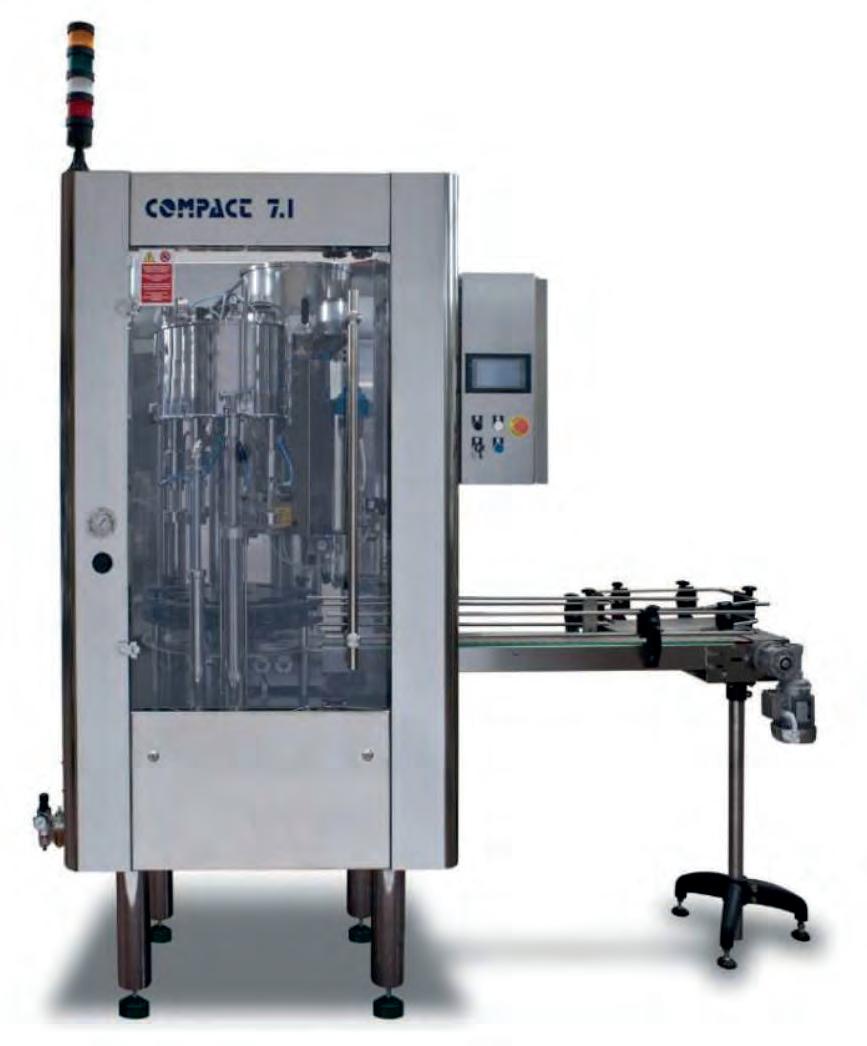 The Compact 7.1 filler is an electro-pneumatic isobaric machine for filling carbonated products in a pressurized tank, with both the inlet and outlet on the same side, making it operable by a single person. The innovative ultra-fast valve performs several programmable cycles: pre-evacuation, isobaric filling under a veil, and pulsed degassing. Additionally, the machine is equipped with all the necessary accessories including conveyor, return unit, and a foam applicator to reduce oxygen pickup. The Compact 7.1 is fitted with mirror-polished AISI 304 stainless steel safety guards with BA finish, in compliance with CE standards. It features large hermetically sealed glass doors that allow for easy inspection and internal cleaning. The few non-stainless steel components are treated with epoxy coating.