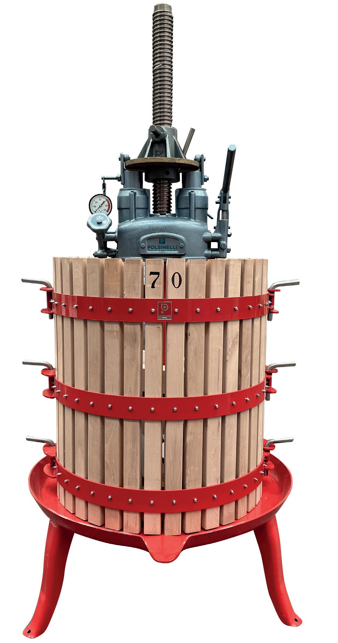 Die hydraulische Presse ist ein professionelles Gerät zur Mostgewinnung aus den Trester. Sie wurde von Polsinelli entwickelt, um sowohl Profi als auch Weinliebhaber zu unterstützen. Der aus Gusseisen gefertigte hydraulische Presszylinder mit Manometer erzeugt mit minimalem Kraftaufwand einen Druck von bis zu 400 Atmosphären auf die Trester.