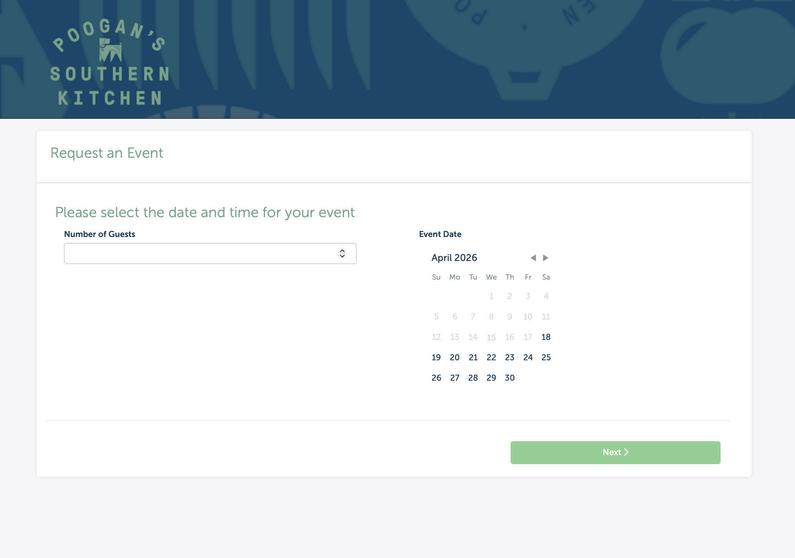 On the inquiry form, first, enter the number of guests you expect to attend (Don’t worry, this can change up to 72 hours before your event ) Then, select your preferred date and time. Click the green “Next” button to proceed.