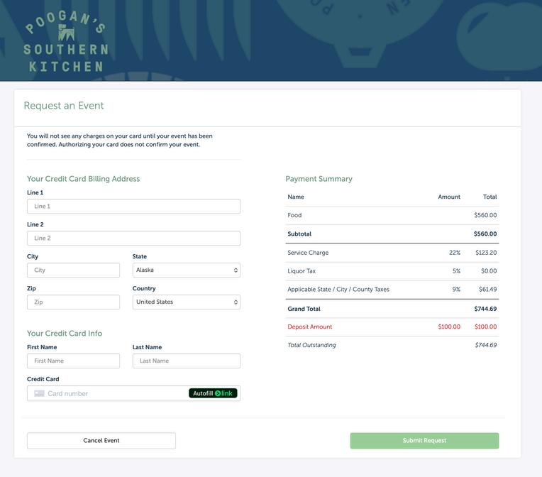 Finally, enter your credit card information. Your card will be charged a $100 deposit only upon acceptance of your event.