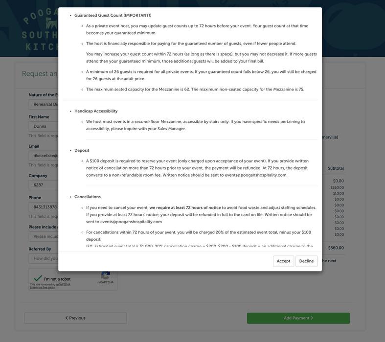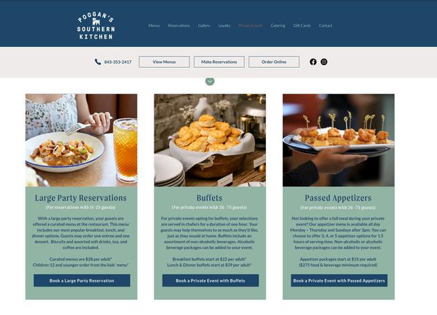 To begin, visit pooganskitchen.com/private-events. Then, scroll and select the blue booking button that applies to your group’s guest count and menu preference Large party reservations (15-25 guests) are offered curated menus Private events (26-75 guests) can choose from buffets or appetizers