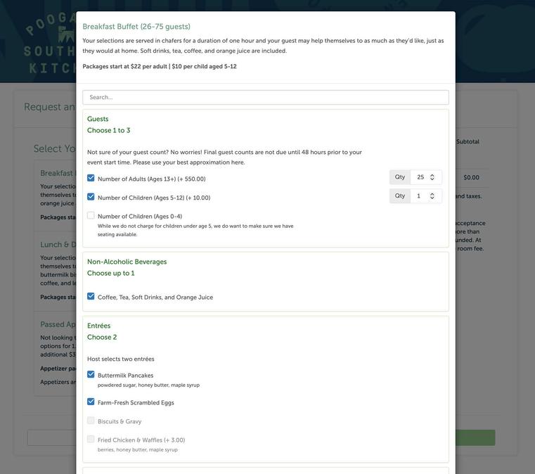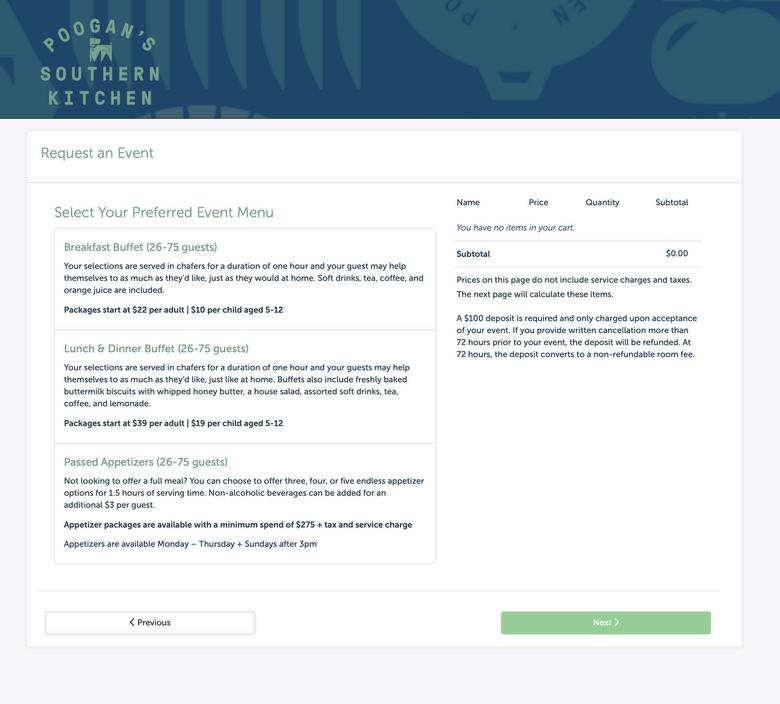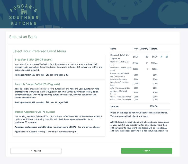 Continue making selections all the way down until all of the headers are green If there is a blue header, you are missing a required selection in that section If you need additional guidance, please reach out to events@pooganshospitality com and we will gladly assist you