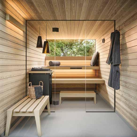 Das Design der TARAS setzt Maßstäbe für eine ästhetische Außensauna, die jede Gartenanlage optisch aufwertet. Der extrem schlanke und zeitgemäße Dachaufbau von nur 30 cm Höhe verleiht der Sauna eine moderne Eleganz und die harmonisch aufeinander abgestimmten Wandund Deckenaufbauten schaffen ein stimmiges Gesamtbild. Mit 23 verschiedenen Grundrissvariationen – mit und ohne Vorraum –, einer Auswahl an Glasfronten, optional wählbarem Panoramaund Seitenfenster und innovativen Fassadendesigns für die Außenverkleidung – wie lasierte Holzverkleidung, Metallic-Oberfläche oder eine Chamäleon-Optik – wird die TARAS zum har-