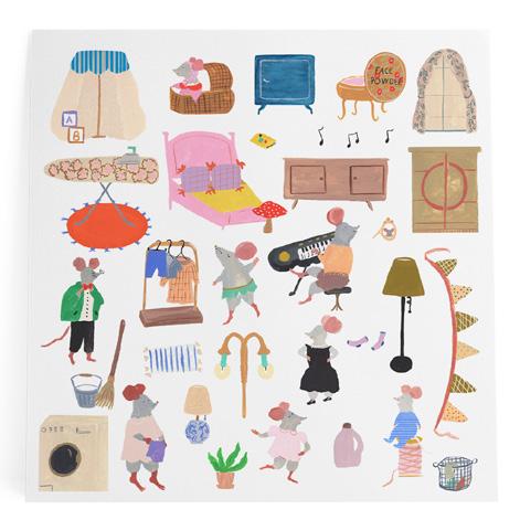Each design starts with hand-drawn lines; has its own playful characters and color combinations that draw Mave ‘s joyful vocabulary. Her favorite materials to create are gouache and pastel paints.