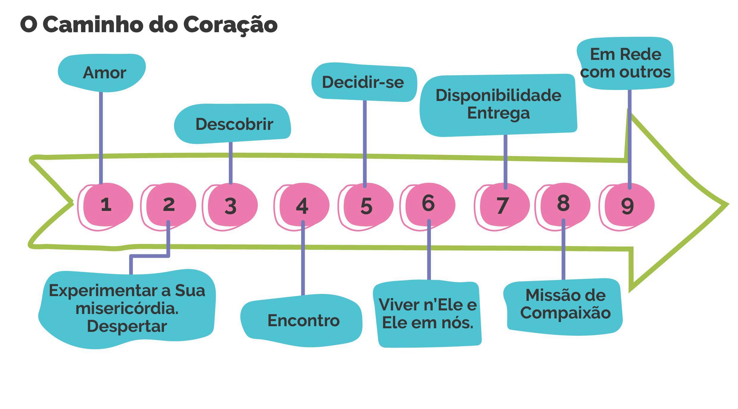 Nove meses, nove etapas, nove passos Nove como número de plenitude, completude ou totalidade. Processo como sequência transformadora, de crescimento e amadurecimento, para dar à luz uma nova vida. Convida a viver um itinerário rumo a um novo nascimento, a uma nova vida o mais próxima possível do Coração de Jesus; com o Seu estilo, com os Seus sentimentos, segundo o Seu modo de proceder O Caminho do Coração ajuda a nascer para a vida do Espírito.