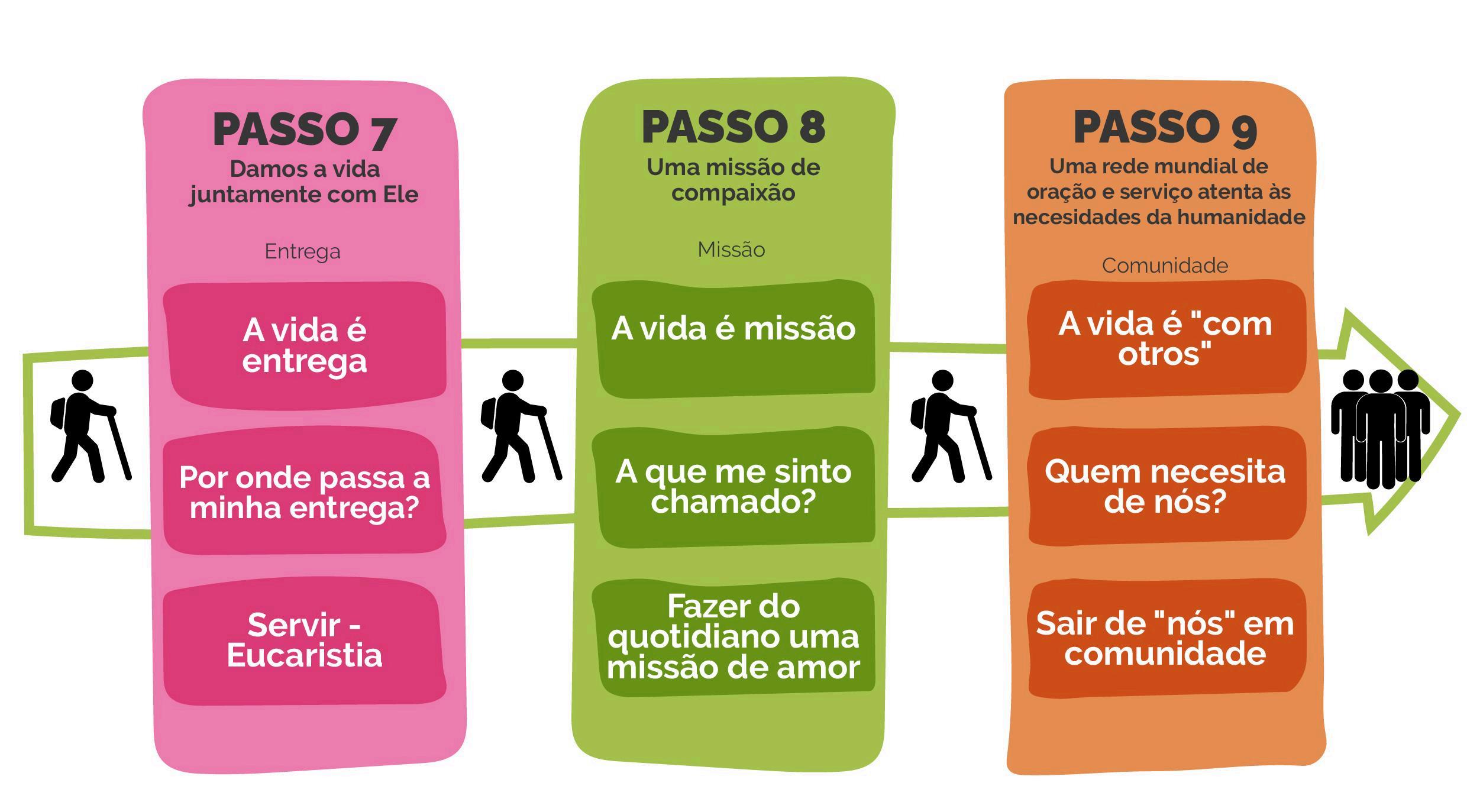 Dentro desta tríade, também podemos identificar referências trinitárias: integrar a vontade amorosa do Pai no meio de um mundo ferido implica participar no mistério pascal (Passo 7). A obediência de Jesus exprime-se através da nossa vida eucarística: somos partidos e repartidos com Ele, somos o Seu Corpo Místico Assim, o Pai continua a alimentar o mundo É o Filho, Jesus Ressuscitado, quem nos torna participantes da Sua missão de compaixão na vida quotidiana (Passo 8), transformando os nossos critérios e atitudes a partir dos nossos contextos concretos. Por fim, a ação do Espírito Santo liga-nos como uma verdadeira rede universal (Passo 9), unindo diversos carismas e mobilizando-nos, através da oração e do serviço, para enfrentar os desafios da humanidade numa missão comum.