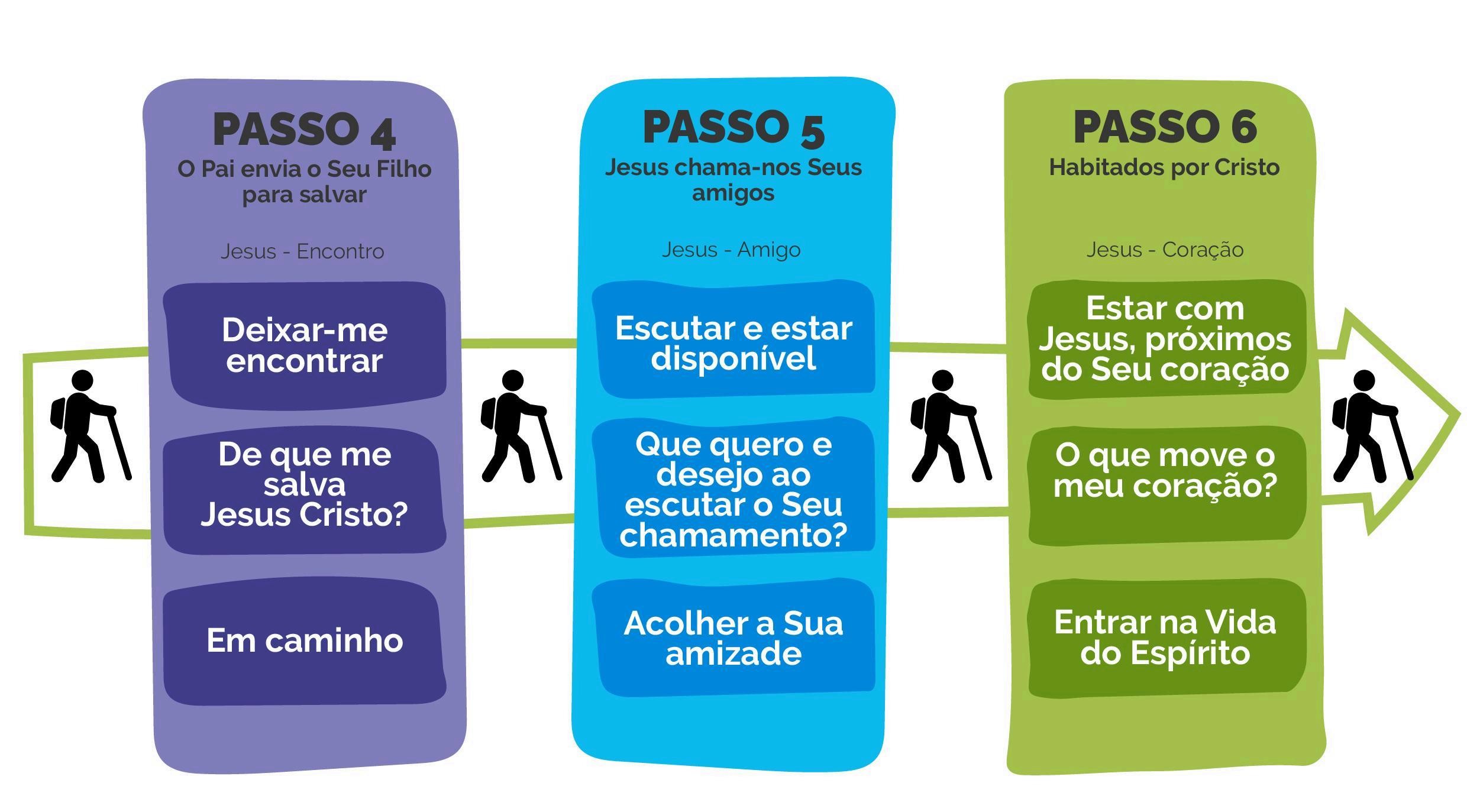 E para quem se abre a essa verdade, ajudado pela graça de Deus, é concedido passar da consciência de uma vida quebrada a uma verdadeira experiência de salvação (Cfr. Dinâmica interna do passo 4). Assim, a meditação sobre a kenosis ou “abaixamento” de Jesus (Cfr Flp 2, 5-11) no sentido de que Ele não se apegou à Sua condição divina, tornando-se servidor e o último entre os homens é o eixo central deste passo, pois ajuda o caminhante a entrar na dinâmica do Coração de Deus, contemplando o modo como Jesus entende o poder: não como uma autoafirmação de superioridade, mas como uma auto doação de si mesmo que traz salvação A ideia fazer com que o caminhante perceba, desde o início, que Jesus não veio para condenar, mas para salvar. Este passo procura que o caminhante se sinta salvo, sustentado, regressando ao caminho por Jesus, convidando-o a meditar e contemplar o Senhor nos Evangelhos, a perceber Seu modo de proceder, e como Ele se aproxima daqueles que sofrem necessidades. A