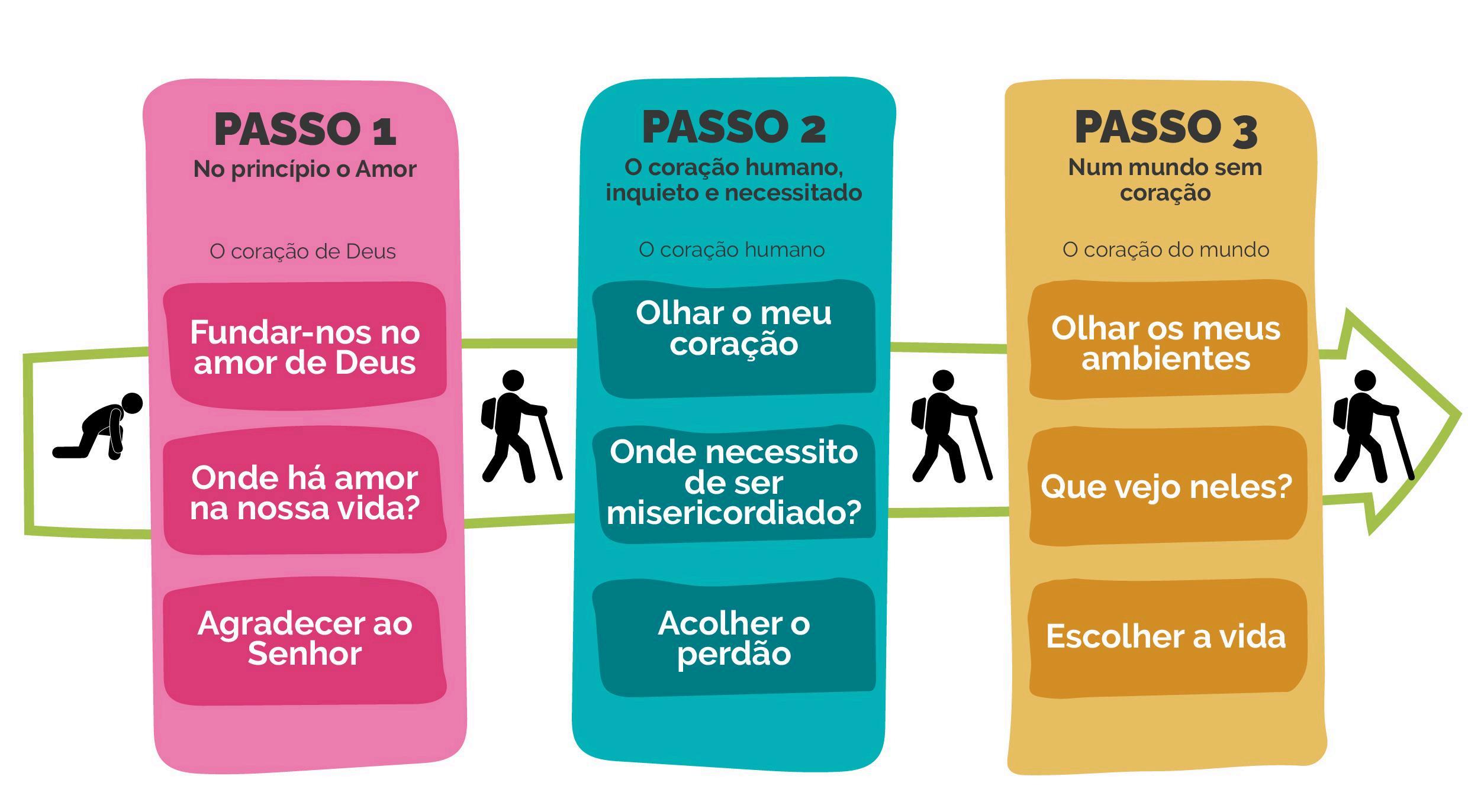 Por isso, esse percurso começa pelo reconhecimento da existência desse amor que sustenta tudo, e como encontra um acolhimento frágil no coração de cada um e na dinâmica do mundo. O caminhante vai percorrer nos três primeiros passos a dinâmica do amor em que se funda a sua vida, experimentando a tensão entre a gratuitidade do Amor infinito, as buscas inquietas de seu coração e a sua existência num mundo quebrado