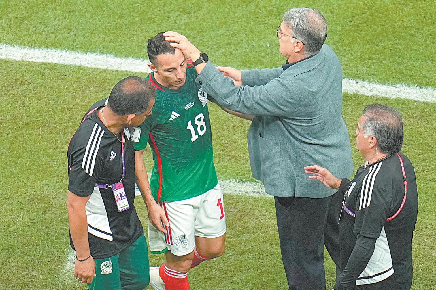 Tata Martino optó por cambiar a sus jugadores más ofensivos, pero no funcionó. (AP) La Albiceleste se sacudió tras la caída ante los árabes y ascendieron al 2o lugar. (AP) Andrés Guardado tuvo que salir por fatiga muscular, apenas en el minuto 41’. (AFP)En medio de la noche de Lusail había destellos de esperanza sobre lo que podría suceder en el enfrentamiento ante un viejo conocido, con incertidumbre por el pésimo rendimiento del equi po mexicano durante el último tramo del proceso de Gerardo Martino, contra un rival que le ha propiciado al Tricolor constantes descalabros en duelos de elimi nación directa y dos ocasiones en Copa del Mundo: Alemania 2006 y Sudafrica 2010, respectiva mente. Pero el público mexicano se preguntaba: ¿Por qué no apro vechar los aires de revancha? y que se pudiera dar una sorpresa para dejar a los albicelestes posibilidades de clasificar Un im pulso de confianza probablemen te alimentado por la atajada del penalti, en manos de Guillermo Ochoa a Lewandowski durante el primer compromiso de la justa.