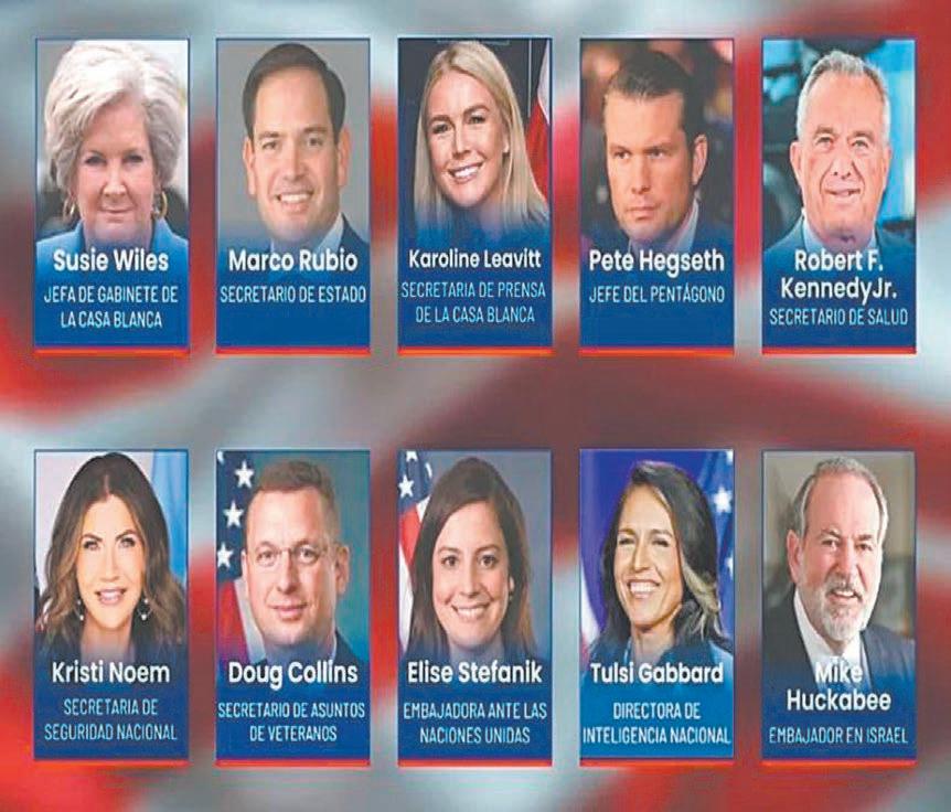 de Protección Ambiental; Scott Turner (42), secretario de Vivienda y Desarollo Urbano; Susie Wiles (67), jefa de Despacho; Mike Waltz (50), ssesor de Seguridad Nacional; Tom Homan (62), jefe del Servicio de Control de Inmigración y Aduanas (ICE, por sus siglas en inglés), y Russell Vought (48 ), Jefe de la Oficina de Administración y Presupuesto. Como jefes de Despacho Adjunto, el presidente electo nominó a Stephen Miller (39), Dan Scavino (48), James Blair (39), y Taylor Budowich (27). Entre los propuestos se incluyen, además, Karoline Leavitt (27), como secretaria de prensa de la Casa Blanca: Karoline Leavitt; William McGinley (46), abogado de la Casa Blanca; Doctor Marty Makary (49), jefe de la Administración de Alimentos y Medicamentos (FDA, por sus siglas en inglés); Dra. Janette Nesheiwat (48), directora de Salud Pública, y el Dr. Dave Weldon (71), director de los Centros para el Control y la Prevención de Enfermedades (CDC, por sus siglas en inglés). En calidad de embajadores y enviados, fueron electos: Steven Witkoff, enviado especial para Oriente Medio; Mike Huckabee, embajador en Israel; Elise Stefanik, embajadora ante la ONU; Matthew Whitaker, embajador ante la OTAN, y Pete Hoekstra, embajador en Canadá. La primera presidencia de Trump se vio afectada por disputas internas. Ahora parece concentrarse en moldear al Gobierno federal a su semejanza, según coinciden analistas políticos y observadores. (Agencias)