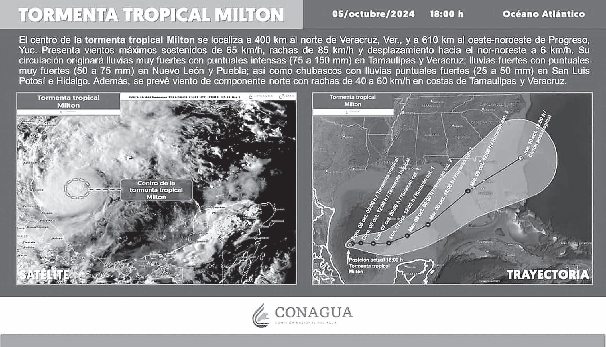 rológico Nacional (SMN) señaló que Milton generará lluvias puntuales intensas en Veracruz, Puebla, Tamaulipas e Hidalgo.