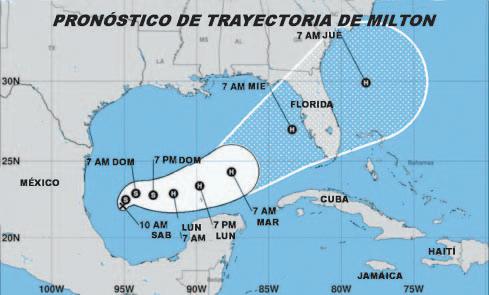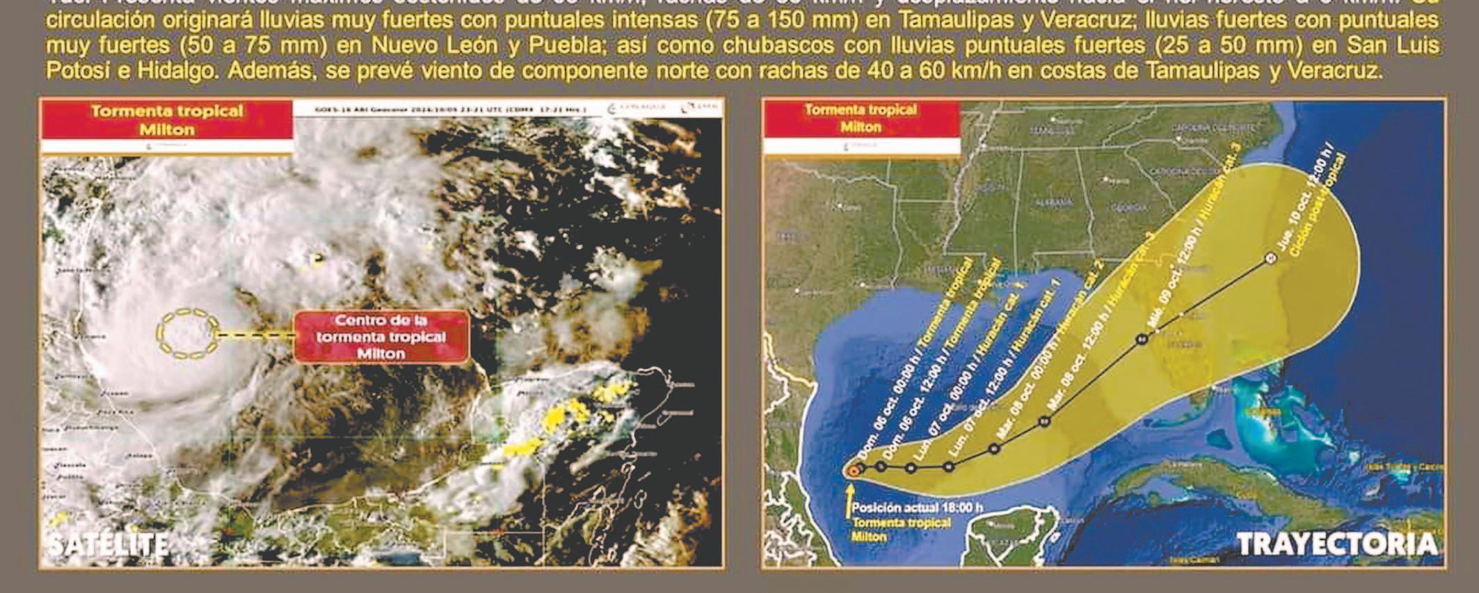 La Tormenta Tropical Milton , que se formó ayer en el Golfo de México, podría intensifi carse durante la noche de hoy domingo y madrugada de mañana lunes a huracán categoría 1, alertó el Servicio Meteorológico Nacional (SMN). Si bien no ingresaría a territorio nacional, se espera que entre el lunes y martes se tenga el mayor acercamiento a la Península de Yucatán, a 100 kilómetros de sus costas en Progre-