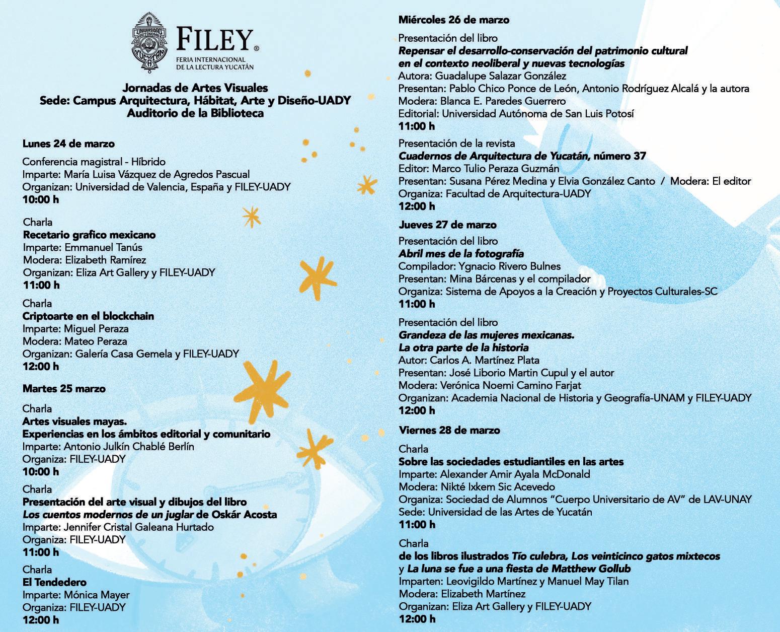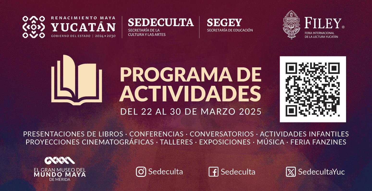 Como es su característica, la FILEY 2025 ofrecerá cientos de actividades de gran diversidad: presentaciones de libros, conversatorios, conferencias, periodismo cultural, congresos y coloquios, artes escénicas, cinematografía, talleres y visitas escolares. Será también un punto de encuentro para universidades del sureste, organizaciones de la sociedad civil, para la promoción y conocimiento de la literatura y cultura maya y, por supuesto, para la comunidad de la Universidad Autónoma de Yucatán, cuya participación es vital en todos los ámbitos de la feria. Este año 2025 el tiempo nos convoca. Nos invita a reflexionar sobre su transcurso, a mirar hacia el pasado, a vivir intensamente el presente y a proyectarnos hacia el futuro con esperanza.