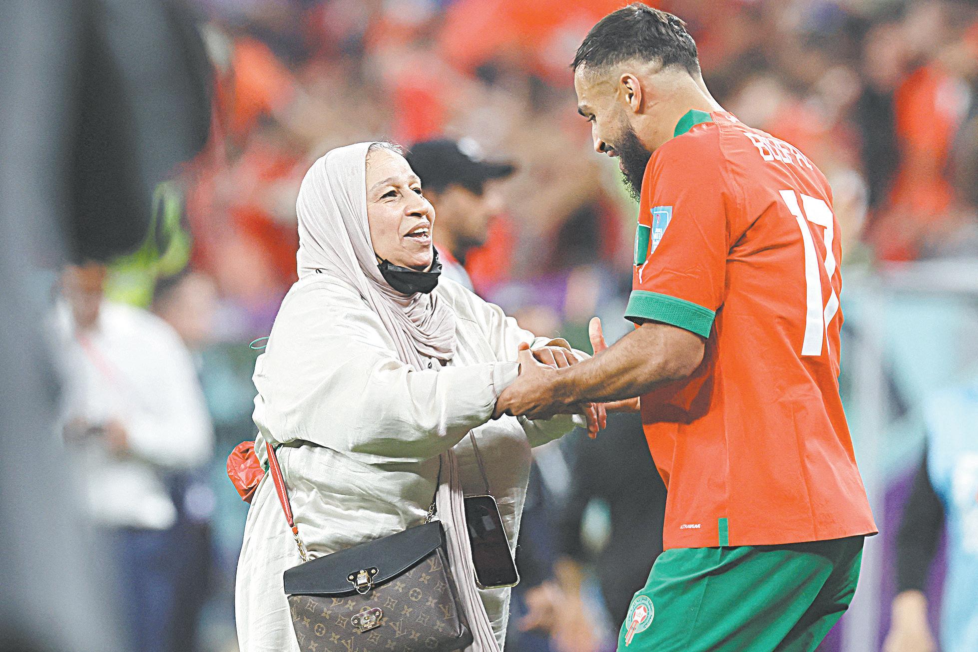 La madre del mediocampista Sofiane Boufal baja al campo para felicitar el hecho histórico de su hijo y de Marruecos, luego de avanzar por primera vez en la historia a las semifinales.