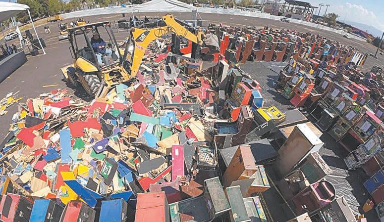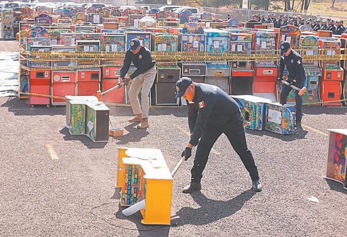 MORELIA. Mich.- El Gobierno de Michoacán destruyó el miércoles 803 máquinas tragamonedas, decomisadas en operativos conjuntos, las cuales generaban de manera ilícita ingresos mensuales por 9.8 millones de pesos a grupos delictivos. Presente en el acto, el gobernador de Michoacán, Alfredo Ramírez Bedolla, llamó a alcaldesas y ediles a colaborar con las autoridades federales, estatales y de justicia para impedir la instalación de máquinas tragamonedas en diver-