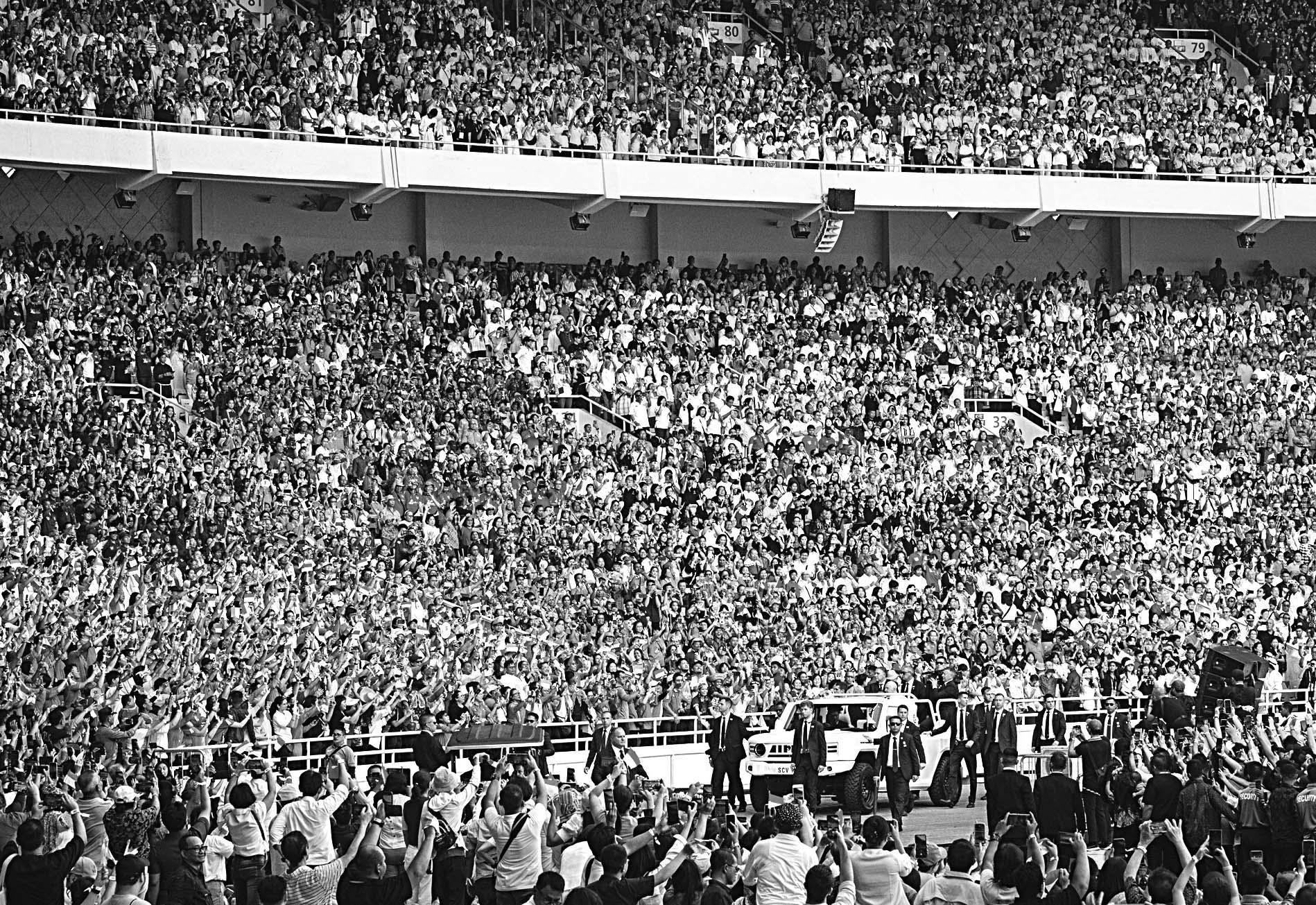 “¡Viva Il Papa!”, “¡Viva Papa Francesco!”, exclamó la multitud, a coro con la música, antes de que empezara la ceremonia en el estadio, que suele acoger los partidos de la selección nacional de fútbol.