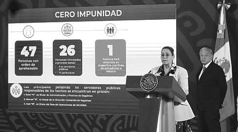 Por su parte, la procuradora fiscal de la Federación, Grisel Galeano García, explicó en la conferencia de prensa mañanera que, por los 2 mil 700 millones de pesos comprobados como daño patrimonial, hay 156 denuncias presentadas ante la FGR, de las cuales, 47 personas fueron investigadas y por cada una de ellas se obtuvo una orden de aprehensión.