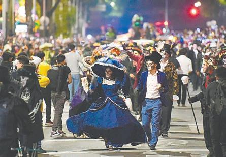 Las principales calles de la capital Ciudad de México se llenaron anoche de catrinas y catrines arropados de vestimentas prehispánicas, tradicionales por regiones y estados mexicanos y otros, entre carros alegóricos y calaveras de más de tres metros.