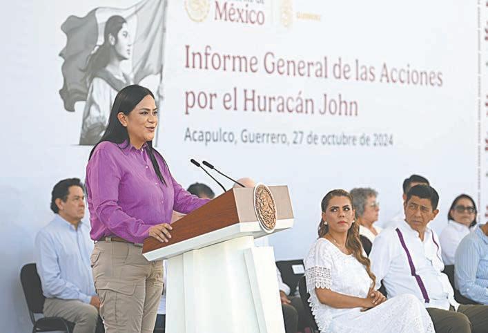 Durante su informe general de las acciones por el Huracán John en Acapulco, Guerrero, la Presidenta estuvo acompañada por la gobernadora guerrerense, Evelyn Salgado Pineda, y el gobernador de Oaxaca, Salomón Jara Cruz, así como los titulares de Gobernación, Protección Civil, Bienestar, Sedatu, Turismo, Defensa Nacional, Marina, Educación Pública y Salud, entre otros.