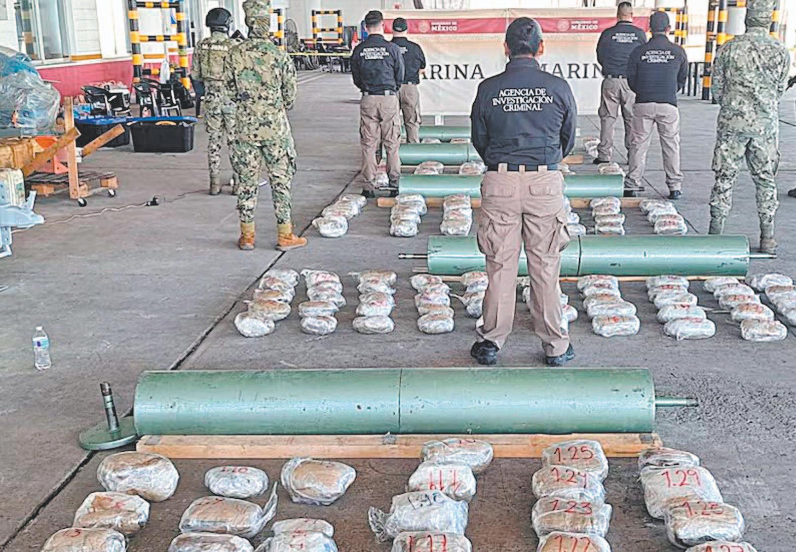 En una primera acción, agentes de la Semar aseguraron 141 kg de presunta metanfetamina, la cual se encontraba oculta en rodillos metálicos para máquina transportadora, en el recinto portuario de Veracruz.