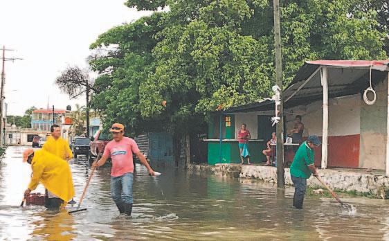 VECINOS se armaron con escobas y palas para limpiar las alcantarillas, e intentar que baje el nivel de agua que ocasionó la tormenta.- (R. Espinoza)