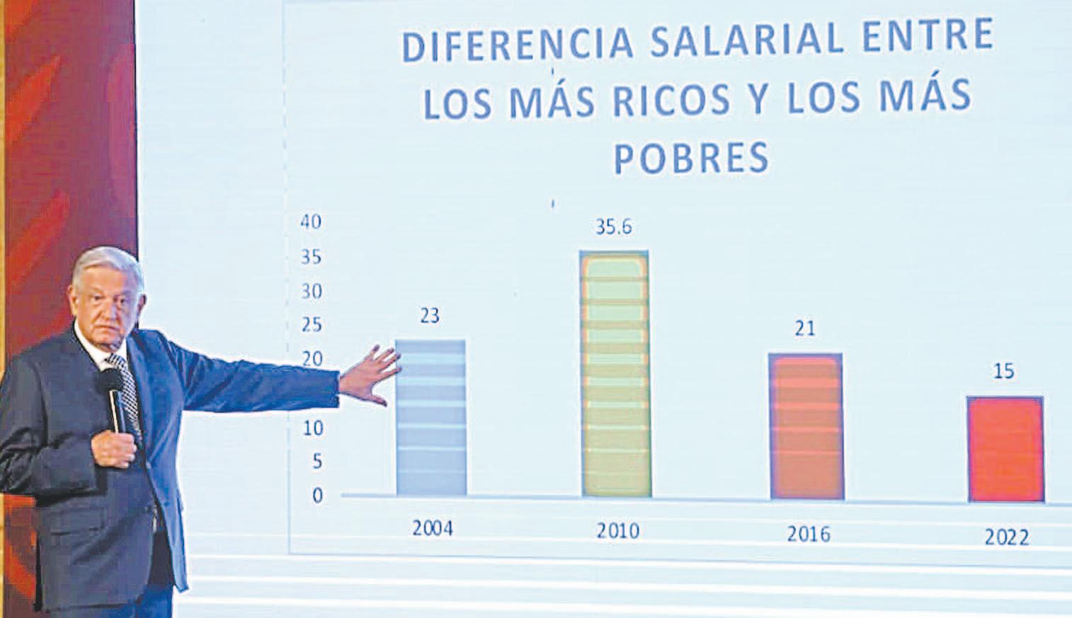 Simultáneamente se cierra la brecha salarial entre los más ricos y los más pobres: en 2010 -año correspondiente al sexenio de Calderón-, los más acaudalados llegaron a ganar 35.6 veces más que la población vulnerable; en 2022 se redujo a 15 veces, refirió López Obrador.