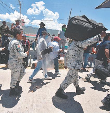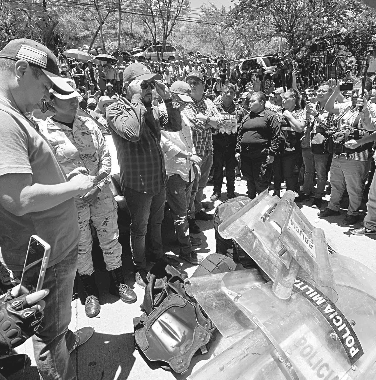TRAS un acuerdo con autoridades, los manifestantes devolvieron cargadores de armas largas y esposas, así como un vehículo blindado que les quitaron a los policías durante el enfrentamiento del lunes.- (Cuartoscuro)