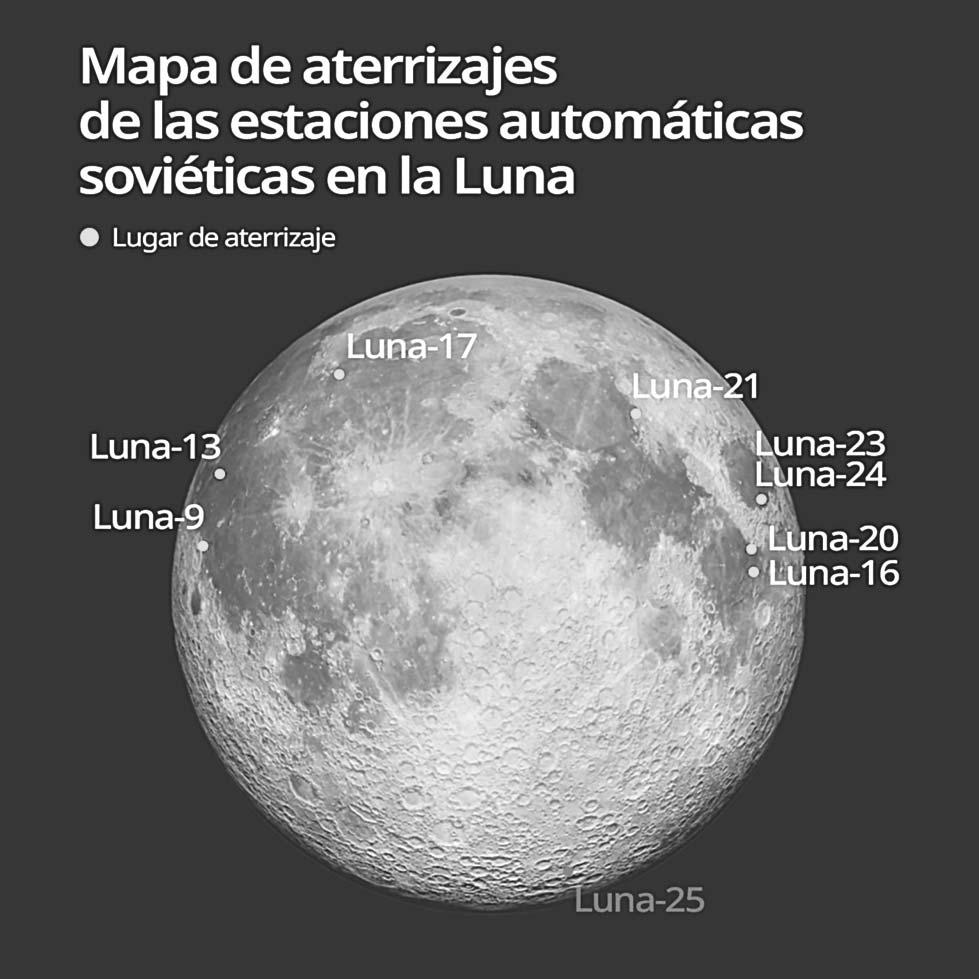 Luna-25, heredera de la soviética Luna-24 , es la tercera nave espacial en recabar muestras de la superficie lunar en agosto del 1976, espera encontrar agua en forma de hielo en nuestro satélite.