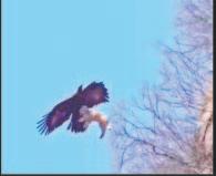 Ante la amenaza, Coco , intenta huir, pero el ave resulta ser más rápida y en cuestión de segundos lo agarró y lo levantó por los aires para luego escapar, pero antes chocó con una caja de plástico y se balanceó de un lado al otro, pero jamás soltó al cachorro.