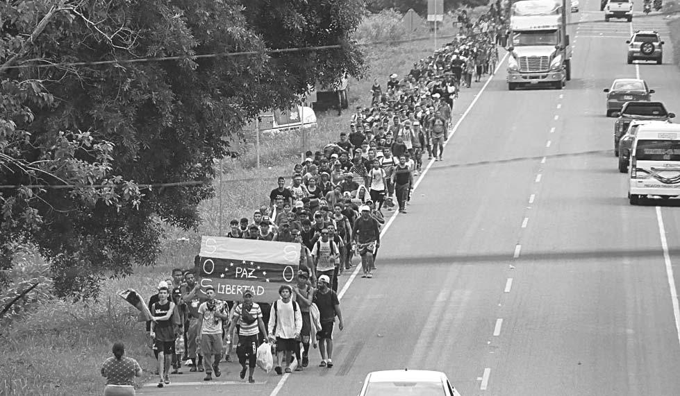 ra pacífica sobre el acotamiento de la carretera mexicana hasta llegar a Tapachula, en Chiapas. En la carretera Ciudad Hidalgo-Tapachula, esta caravana de migrantes es custodiada por unidades de la Guardia Nacional, la división de caminos, así como por policías estatales de Chiapas y locales.