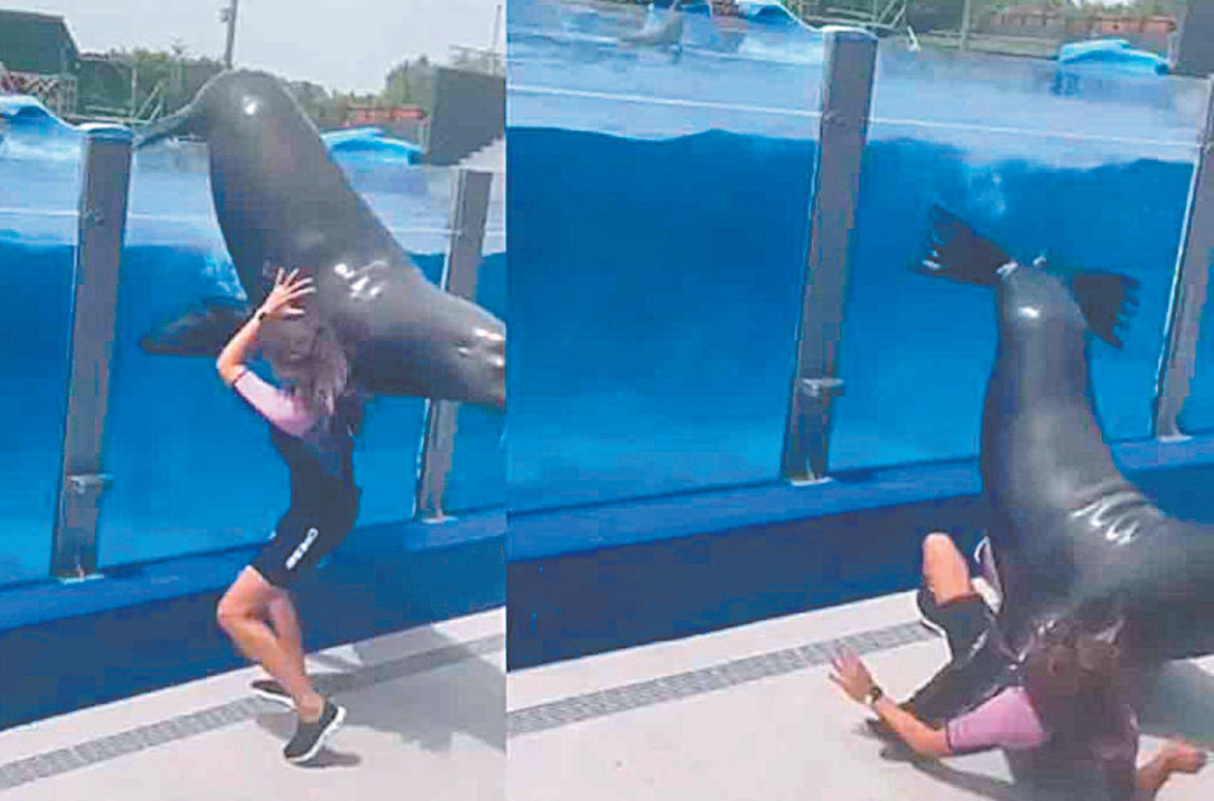 No obstante, al percatarse de lo que podría ocurrir, una entrenadora corrió, a fin de evitar que el león marino saliera del agua, pero terminó con un fuerte golpe.