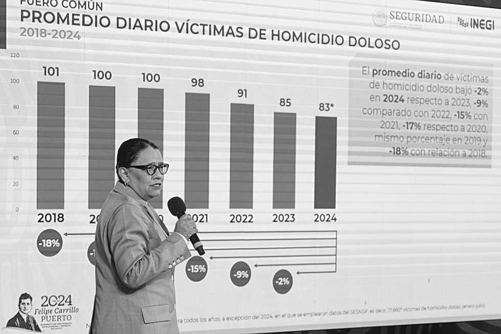 Además, desde el Salón Tesorería de Palacio Nacional y frente al presidente de México, Andrés Manuel López Obrador, la próxima secretaria de Gobernación en el sexenio que encabezará la presidenta electa Claudia Sheinabum Pardo, refirió que se sigue trabajando con los institutos de las mujeres de los estados y con las fiscalías estatales para que no haya impunidad. En relación al homicidio doloso, destacó que éste cayó 18% en el mismo mes de julio, por lo que se siguen intensificando las acciones con los gobiernos estatales y municipales. En más sobre este tema, Rosa