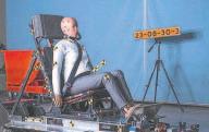 Atado a un sillón, SET 50F es lanzado a 16 km/h sobre un carril metálico en un centro de pruebas de Linköping, al Sur de Estocolmo.