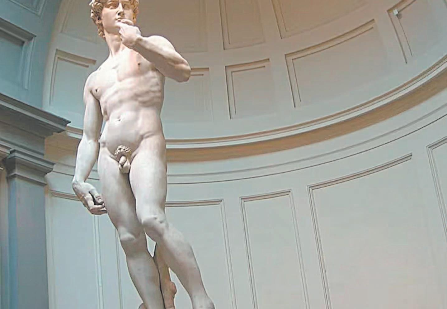 La escultura de mármol de Miguel Ángel representa al David bíblico, desnudo y con una honda sobre el hombro y una piedra en la mano, listo para la batalla con Goliat.