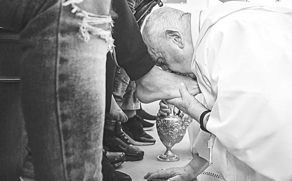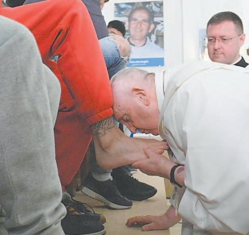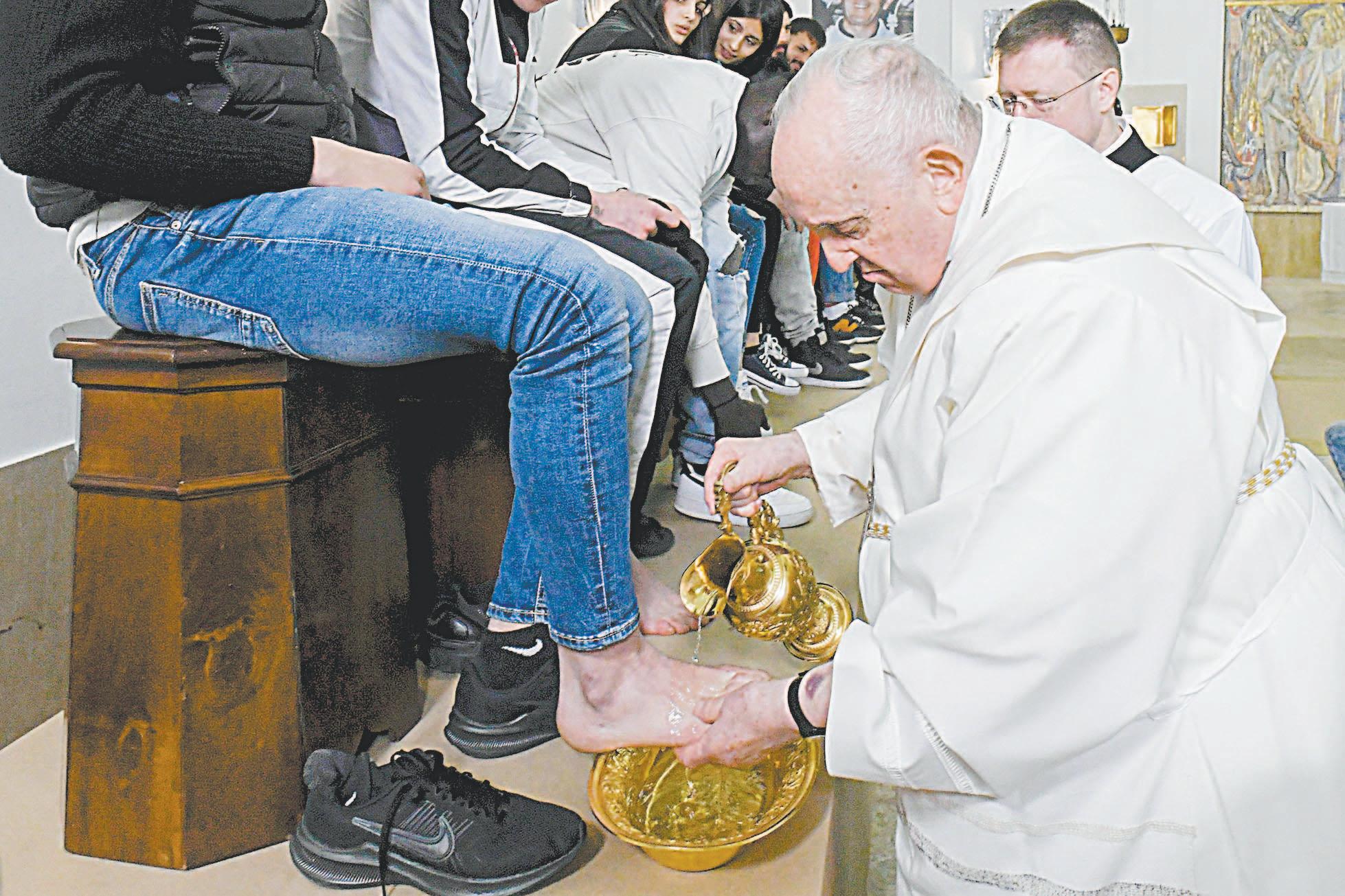 El Papa repitió ayer el rito con 10 varones y dos mujeres que cumplen condenas en el lugar. Se inclinó, vertió agua sobre un pie de cada uno, lo secó suavemente con una toalla y lo besó.