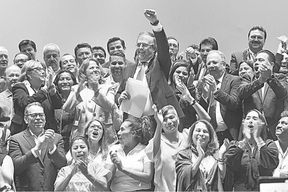 Durante el anuncio de su renuncia, el funcionario federal estuvo acompañado por presidentes municipales, así como diputados, senadores y colaboradores cercanos a él, quienes lo vitorearon con gritos de “¡Marcelo, Marcelo!”.