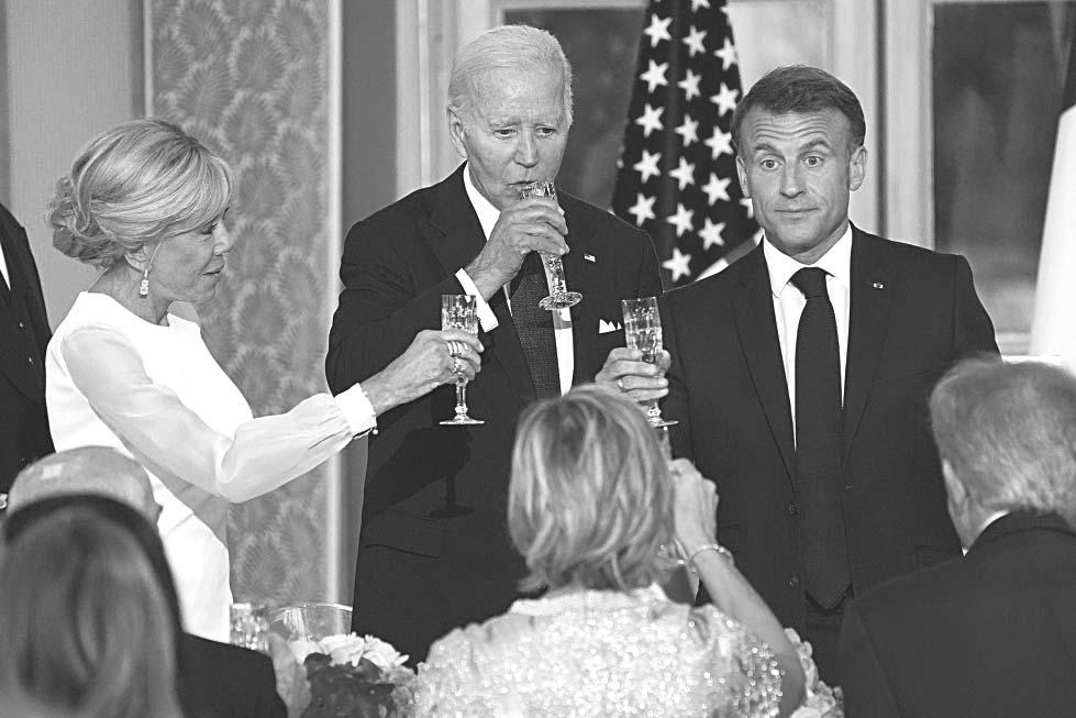 “Unidos resistimos, divididos caemos”, dijo el mandatario francés Emmanuel Macron al brindar por Biden en una cena de Estado.
