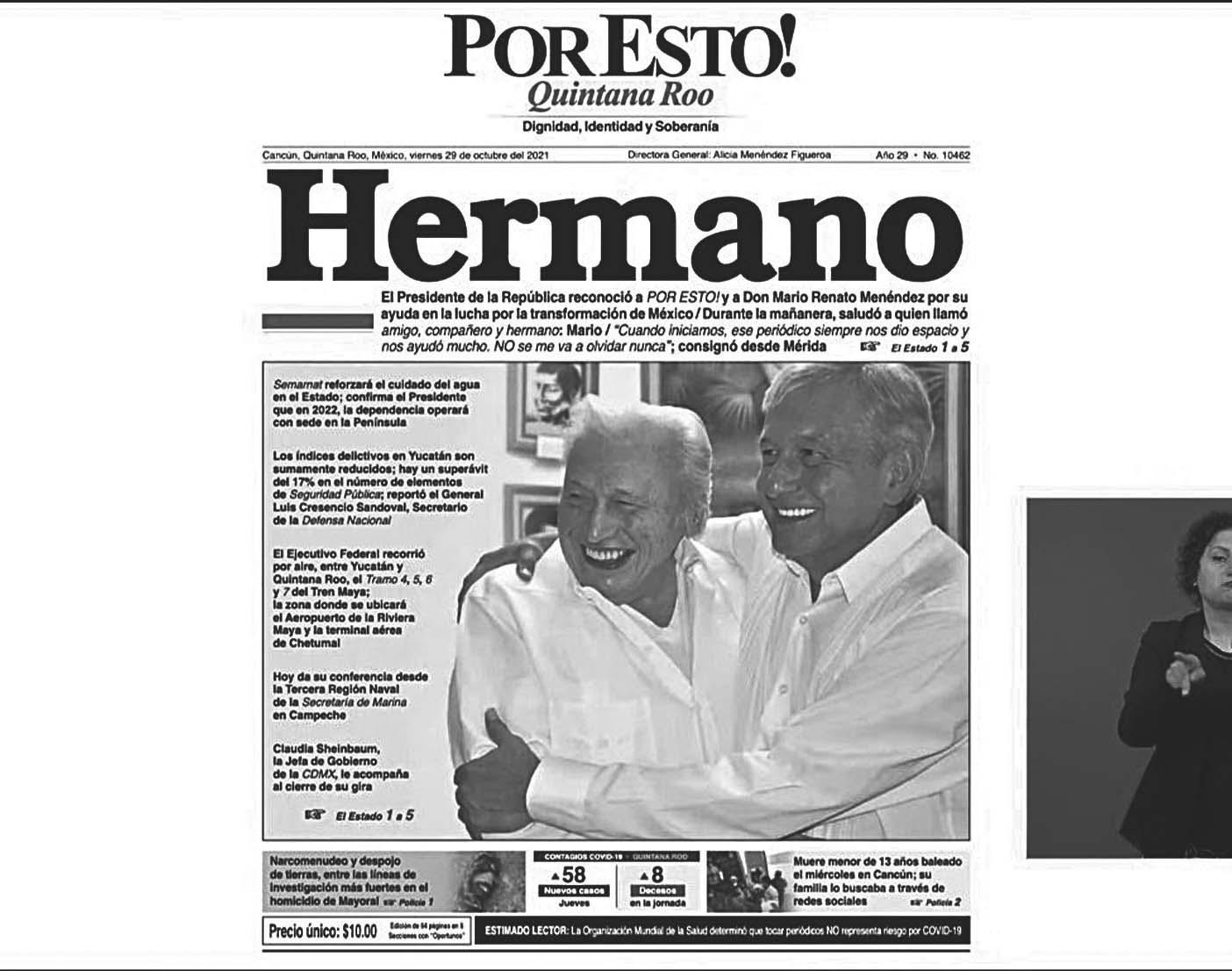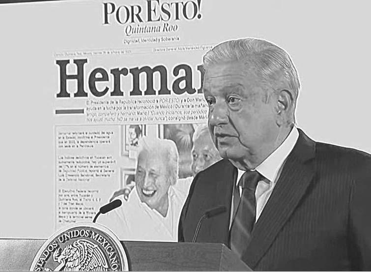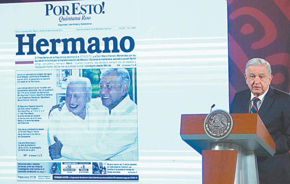 “Quiero expresar mi más profundo pésame por el fallecimiento de Mario Renato Menéndez, periodista y fundador de los diarios Por Esto! y la revista Por Qué?”, aseguró López Obrador al inicio de su conferencia de prensa matutina, realizada en Palacio Nacional.