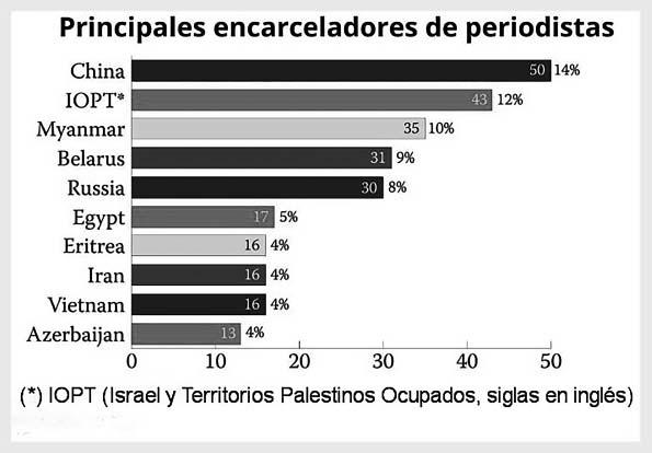 Israel, una democracia multipartidista, rara vez había aparecido en la lista anual de condenas a prisión antes del estallido de la guerra de Gaza en el 2023. No obstante, “se catapultó al segundo puesto el año pasado al tratar de silenciar la cobertura desde los territorios palestinos ocupados”, señala el informe en el que recuerda que todos los periodistas detenidos por Israel son palestinos.