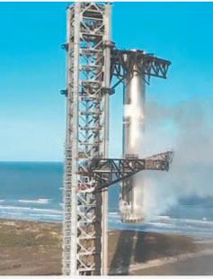 BOCA CHICA BEACH.- SpaceX logró ayer, por segunda vez, atrapar durante el descenso la primera etapa propulsora de su megacohete Starship en los brazos mecánicos denominados palillos, instalados en su torre de lanzamiento, una hazaña de ingeniería lograda por primera vez en octubre del año pasado. El propulsor descendió de forma precisa por sí mismo usando sus motores, lo que causó vivas y aplausos del personal de misión de SpaceX en los cuarteles generales de la compañía en Boca Chica, Texas. La nave Starship perdió