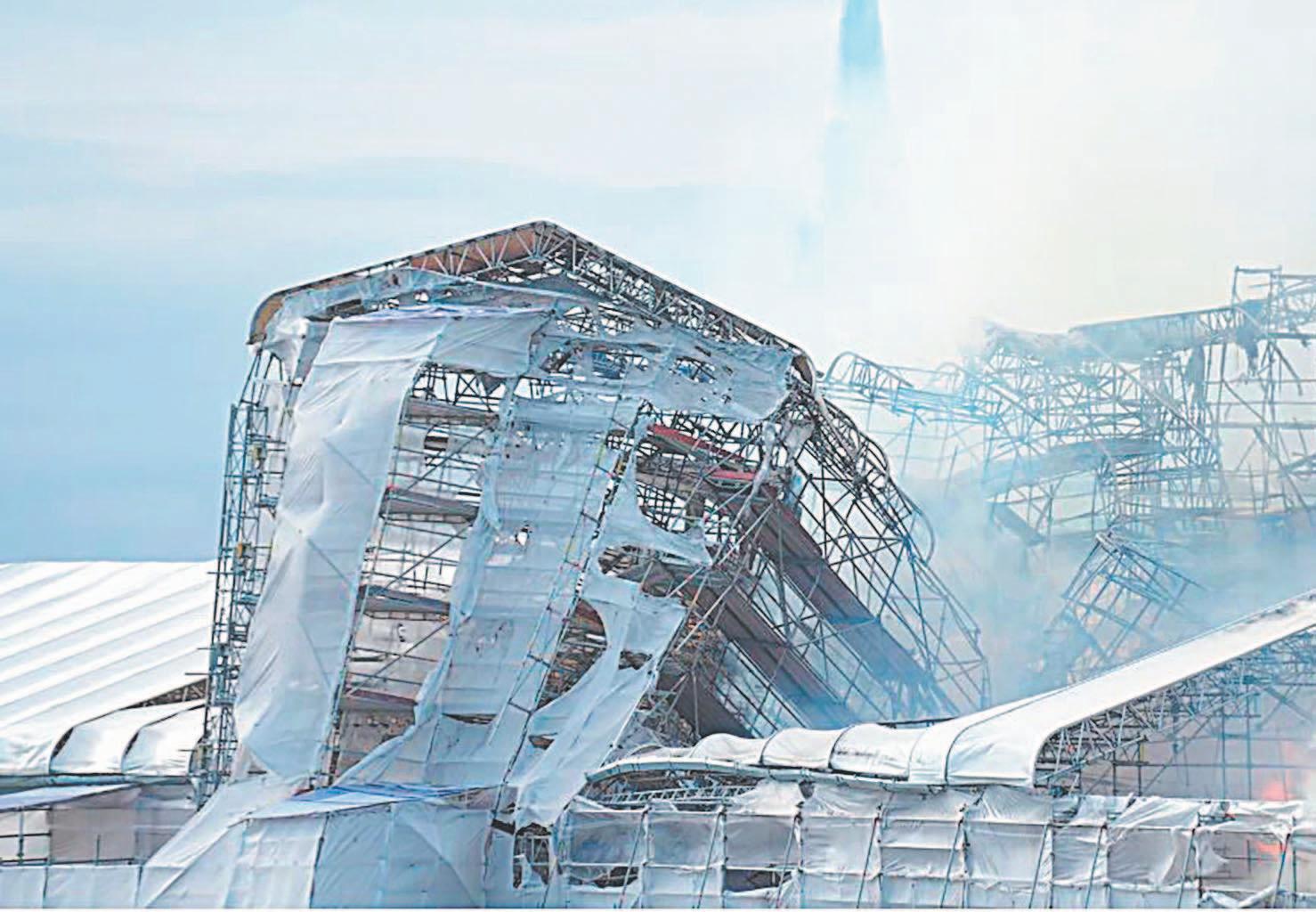 La estructura se desplomó hacia el interior del edificio con un gran estruendo, según imágenes de los medios daneses. A lo largo de esta fachada se habían colocado soportes para limitar el riesgo de derrumbe.