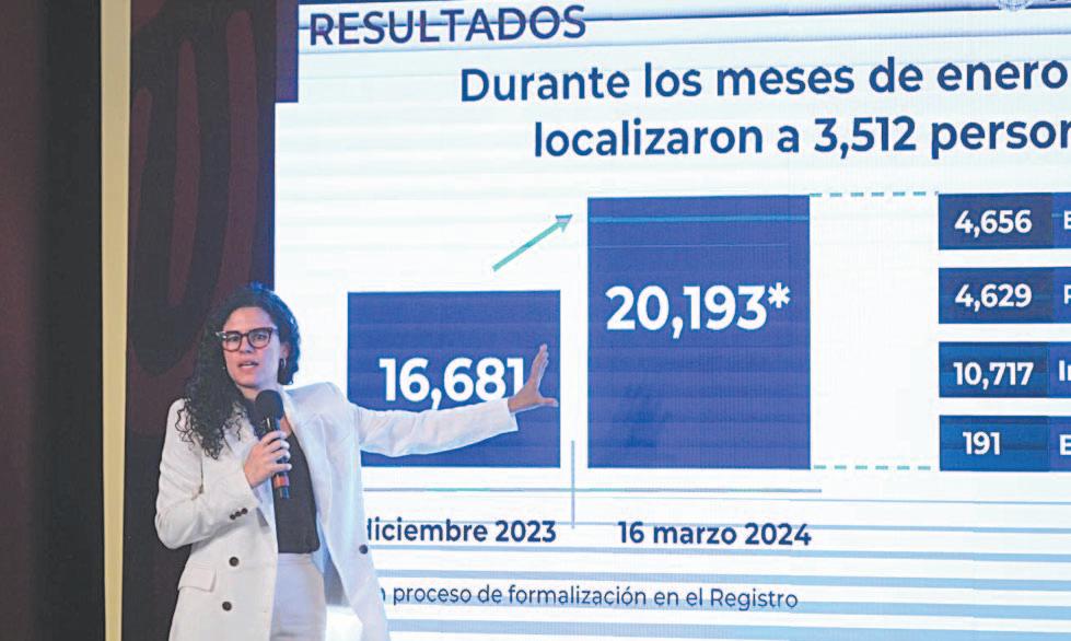 Estrategia Nacional de Búsqueda Generalizada, del Gobierno federal, ha localizado a 20 mil 193 personas, de las cuales, 3 mil 512 se sumaron de enero a marzo de este año a las 16 mil 681 del último reporte presentado el 14 de diciembre de 2023, aseguró ayer la secretaria de Gobernación, Luisa María Alcalde Luján.