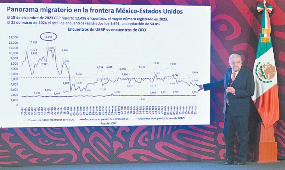 En el Salón Tesorería, el Mandatario federal respaldó sus declaraciones con una gráfica que aseguró que, mientras al 18 de diciembre pasado la Oficina de Aduanas y Protección Fronteriza (CBP, en inglés) reportó 12 mil 498 encuentros en la frontera Norte del país, para el 21 de marzo la cifra bajó a 5 mil 645 encuentros.