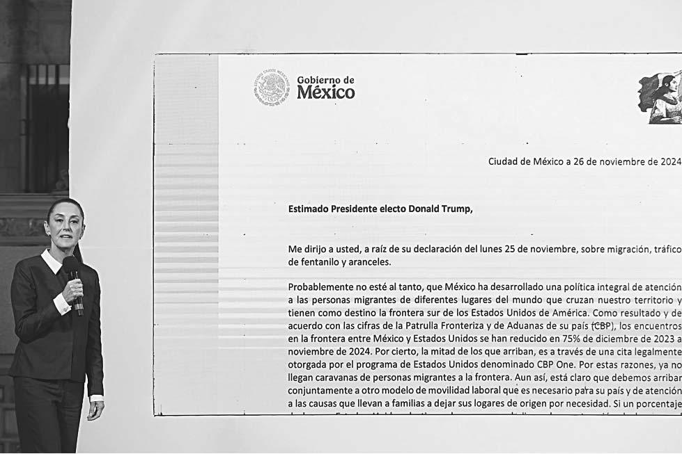 La Casa Blanca impondrá un arancel del 25% a todos los productos de México y de Canadá, así como un 10% adicional a las tarifas establecidas para las importaciones de China. En su misiva, Sheinbaum resaltó que México ha desarrollado una política integral de atención a las personas migrantes de diferentes lugares del mundo que cruzan territorio mexicano y que tienen como destino la frontera sur de los Estados Unidos de América, por lo que como resultado de esta política y acuerdo con las cifras de la Patrulla Fronteriza y de Aduanas de su país (CBP), los encuentros en la frontera entre México y Estados Unidos se han reducido en 75% de diciembre de 2023 a noviembre de 2024.