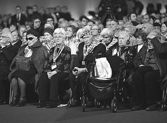 cualquier otra forma de odio”, dijo. Algunos sobrevivientes llevaban gorras y pañuelos a rayas azules y blancas, símbolo de sus antiguos uniformes. Al pie del muro, que tocaron con una mano en silencio, encendieron velas en memoria de los fallecidos.