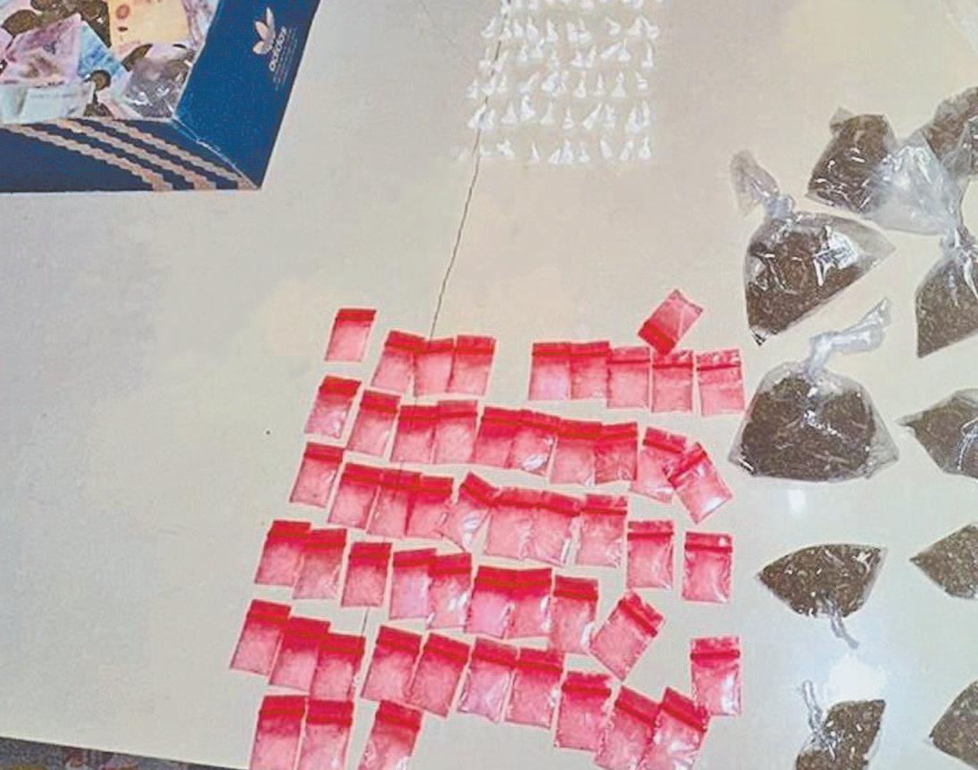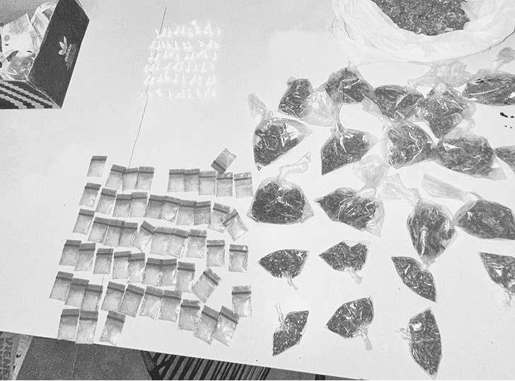 102 dos bolsitas de marihuana, 99 dosis de una sustancia parecida a la cocaína, un arma de fuego corta, un cargador y 14 cartuchos útiles, un arma de fuego tipo subametralladora abastecida con 11 cartuchos útiles, dos cangureras y dinero en efectivo.